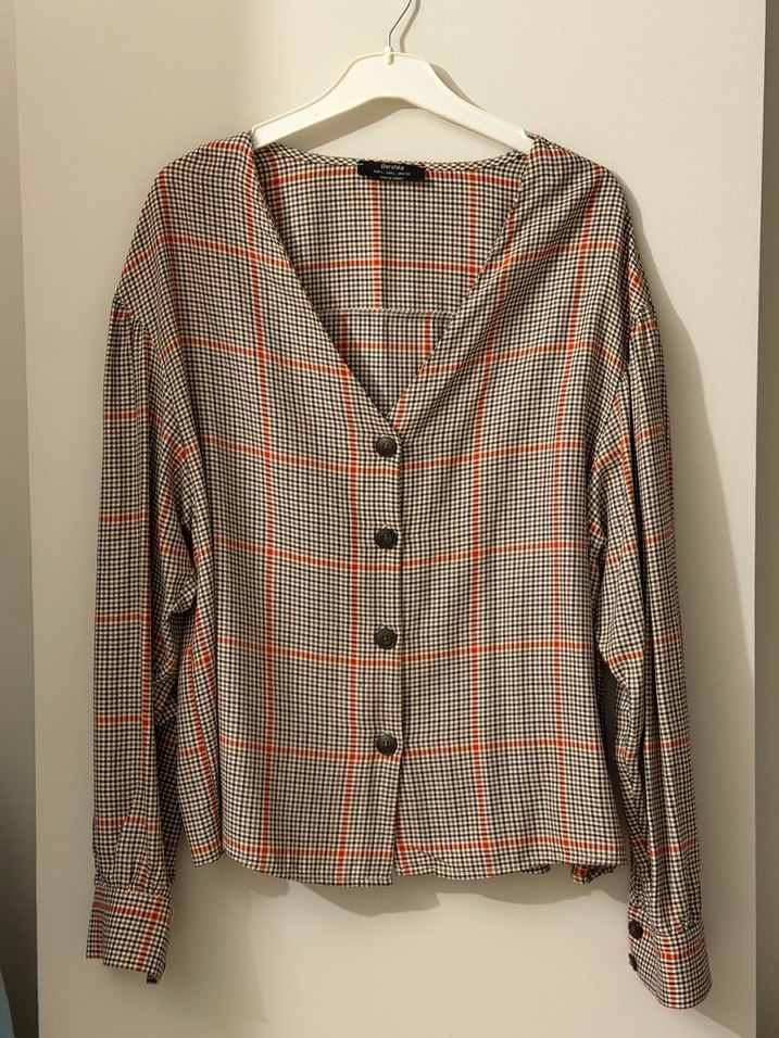 Bej ve gri kareli, V yakalı ve düğmeli kadın gömleği. Uzun kollu, bol kesim ve keten kumaştan, ofis için uygun.