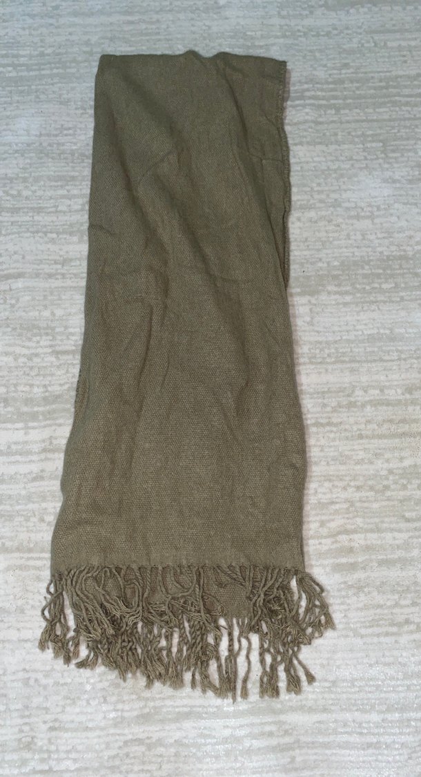 Bej ve gri tonlarında, keten kumaştan yapılmış, püsküllü ve dökümlü kadın şalı.