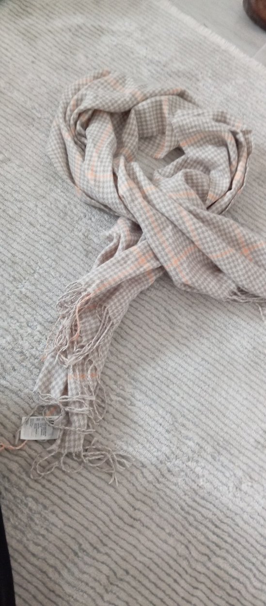 Bej ve gri tonlarda, keten kumaştan salaş bohem kadın şal atkısıdır. Yumuşak dokusuyla rahat bir kullanım sunar.