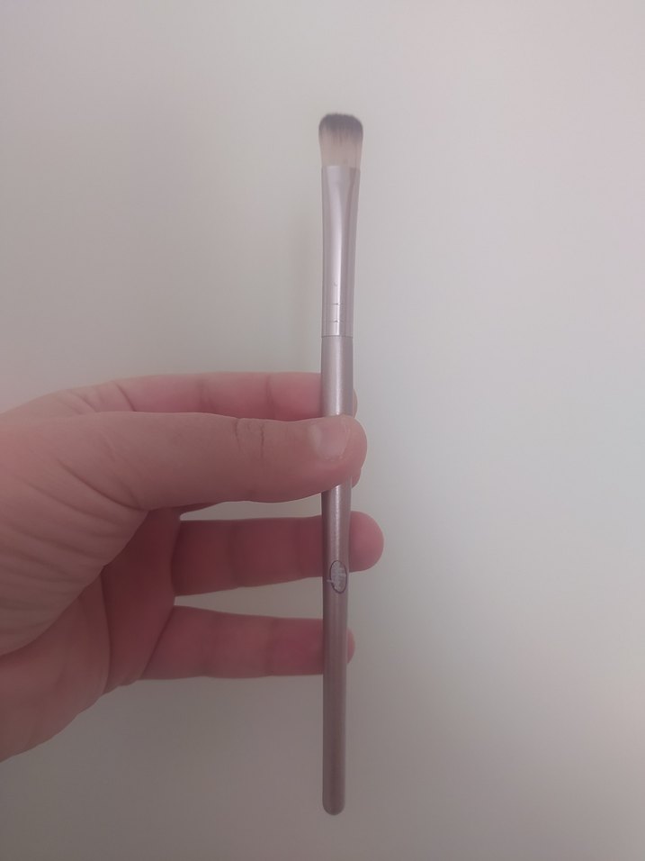 Yumuşak kıllara sahip bej ve gri makyaj fırçası, ince sapı ile hassas uygulama sağlar.