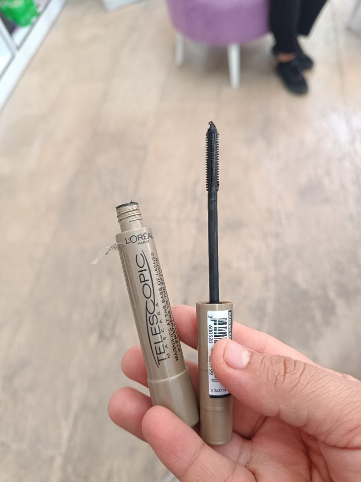 L'Oréal Telescopic maskara, bej-gri renkte, ince fırçasıyla kirpiklere uzunluk ve belirginlik verir. ✨