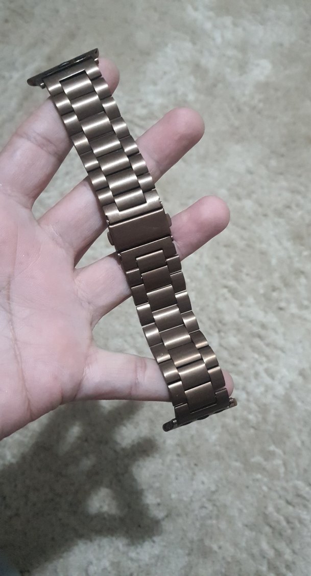 Bej ve gri tonlarında metalden yapılmış, minimalist tarzda erkek saat kordonu. ⌚