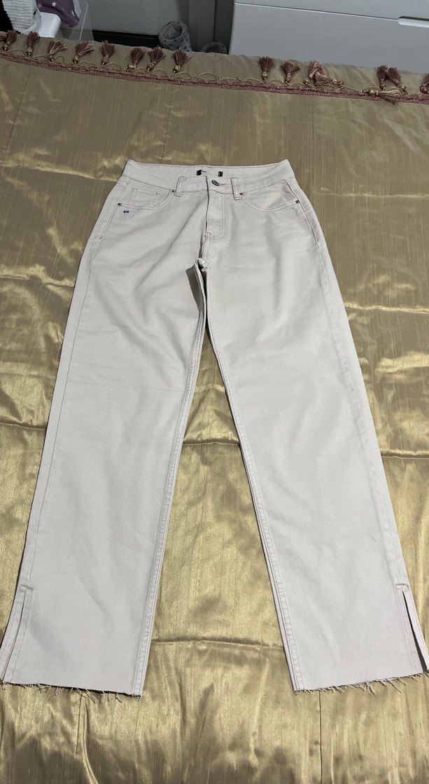 Bej ve gri tonlarında, midi boyda, regular fit kesime sahip kadın denim pantolon. Günlük kullanıma uygun, sokak stilinde rahat ve şık.