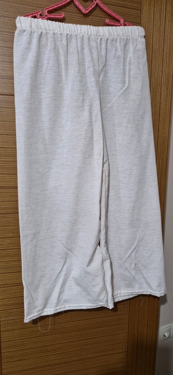 Keten kumaştan, bol kesim ve midi boyda, yırtmaç detaylı bej gri tonlarında kadın pantolon. Minimalist ve sade tarzda, günlük kullanıma uygun.