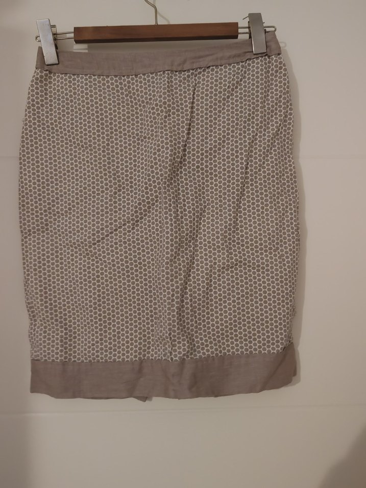 Bej ve gri tonlarda pilili ve midi boy kadın eteği. Minimalist ve çağdaş ofis stiline uygun, vücuda oturan kesim.
