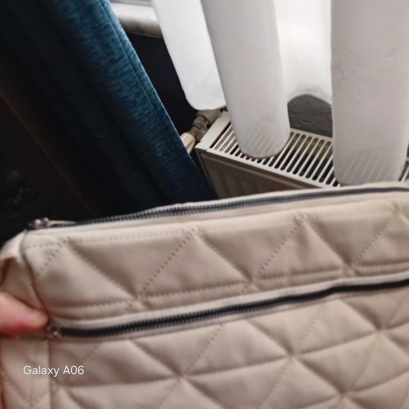 Sentetik kumaştan yapılmış, fermuarlı kapamalı, bej ve gri minimalist tasarımlı çağdaş kadın çantası. Günlük kullanım için uygundur.