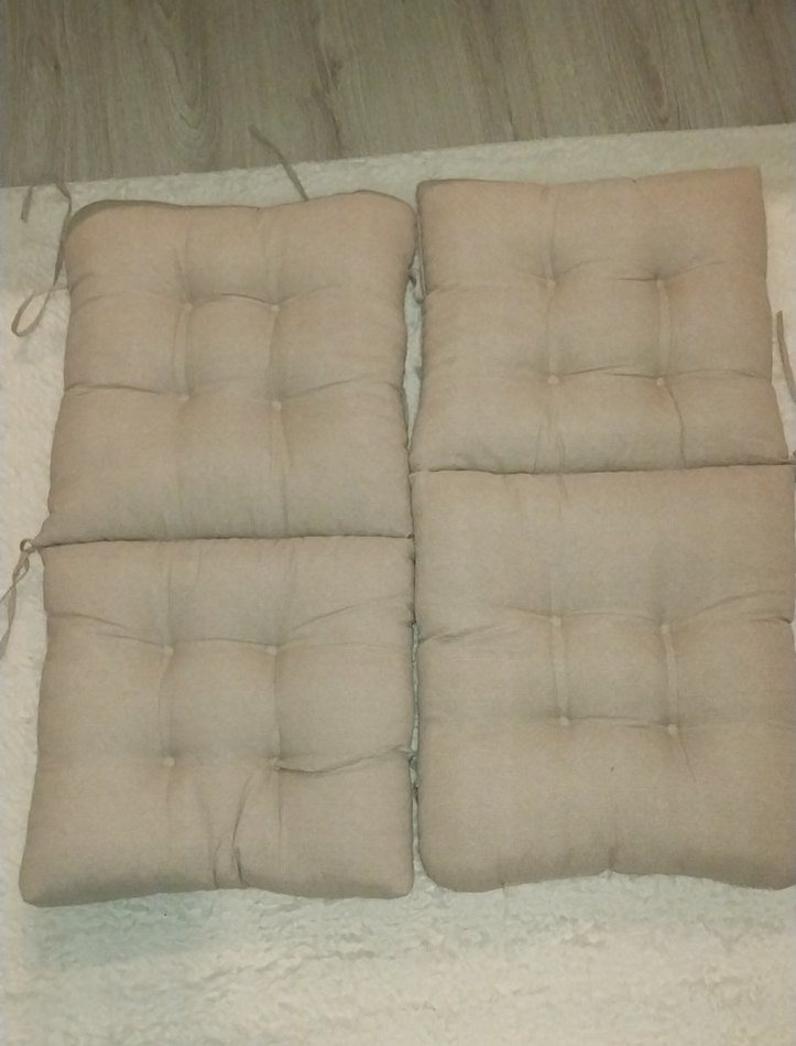 Bej gri tonlarında, düğmeli sade tasarıma sahip modern tarzda yumuşak ve rahat oturma yastıkları. ️bir ipi kopuk