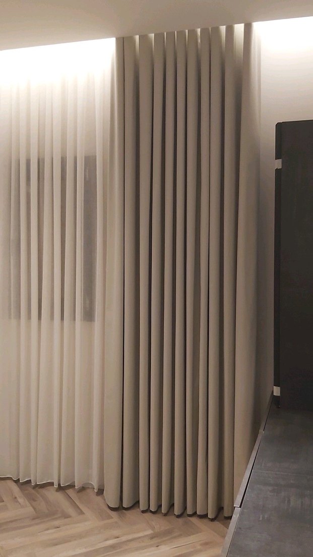 Bej ve gri renklerde, modern tarzda, desensiz ve düzgün dokulu perdeler, odanıza temiz bir görünüm katar.