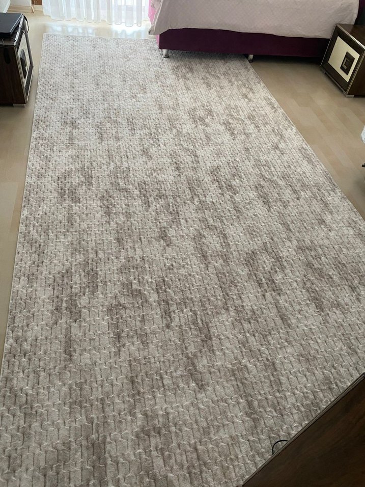 Bej ve gri tonlarında, desen içermeyen modern tarzda bir halı. Her odaya yumuşak ve nötr bir dokunuş katar. uzunluk 4 genişlik 2 metre