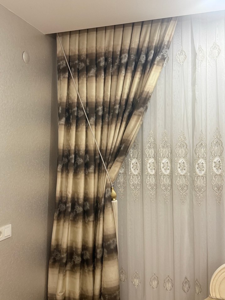 Bej ve gri tonlarında batik desenli, modern klasik tarzda şık fon perde.