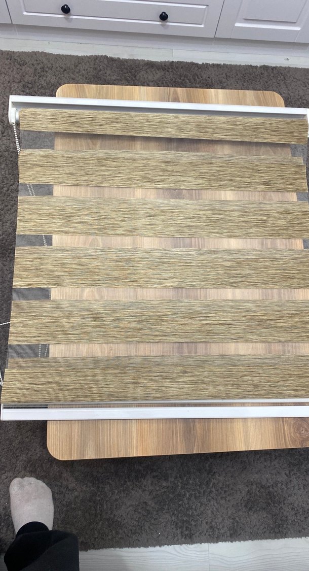 Bej ve gri tonlarında, ışık kontrolü sağlayan modern zebra perde.