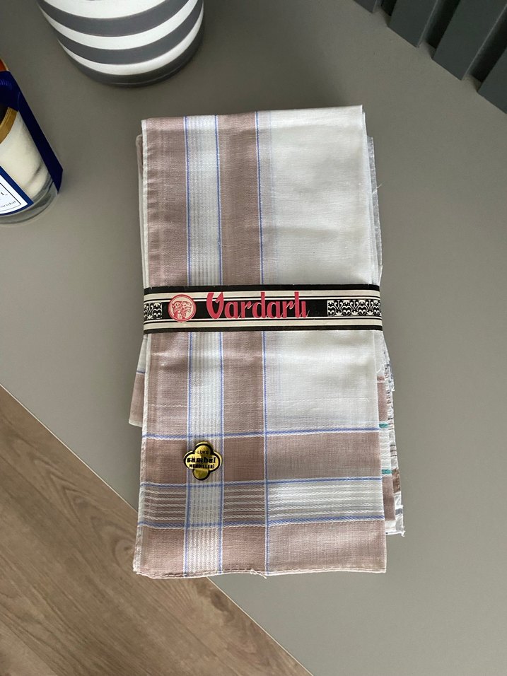 Bej ve gri tonlarda, nakışlı klasik erkek mendili. Paris esintili ve "Vardari" etiketi bulunur.