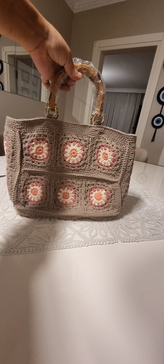 Bej ve gri renklerde, nakışlı çiçek desenli örgü kadın çantası, ahşap saplı, günlük kullanıma uygun bohem tarzda. el emeği göz nuru astarli keçeli