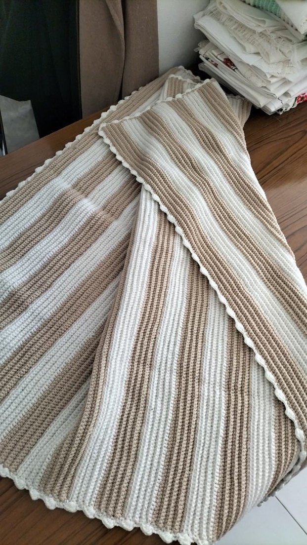 Bej ve gri renklerde, desen içermeyen yumuşak örgü çocuk battaniyesidir. Çocukları sıcak tutmak için uygundur.