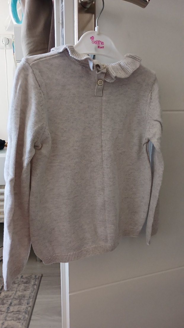 Bej ve gri tonlarda, uzun kollu, küçük fırfırlı yakalı, bol kesim örgü kız hırkası.