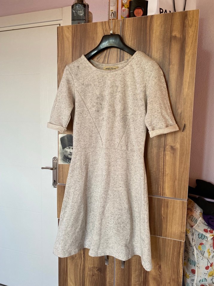 Bej gri tonlarında, kısa kollu ve yuvarlak yakalı, rahat kesimli örme keten midi elbise. Günlük kullanıma uygundur. Lekeleri olduğu için ucuza koydum