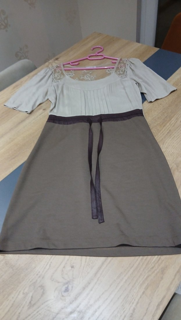Pamuklu, salaş kesim, belden kuşaklı hamile tunik. Bej ve gri tonlarında, askılı kol ve straplez yakalı, günlük kullanıma uygun.