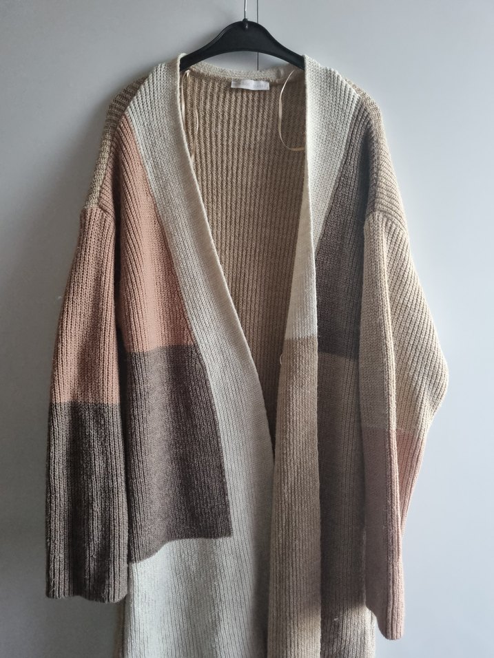 Bej ve gri tonlarda, örgü dokulu, uzun kollu, salaş kesim ve midi boy kadın hırkasıdır. Günlük rahat kullanıma uygun, modern tarzda, desensiz bir üründür.