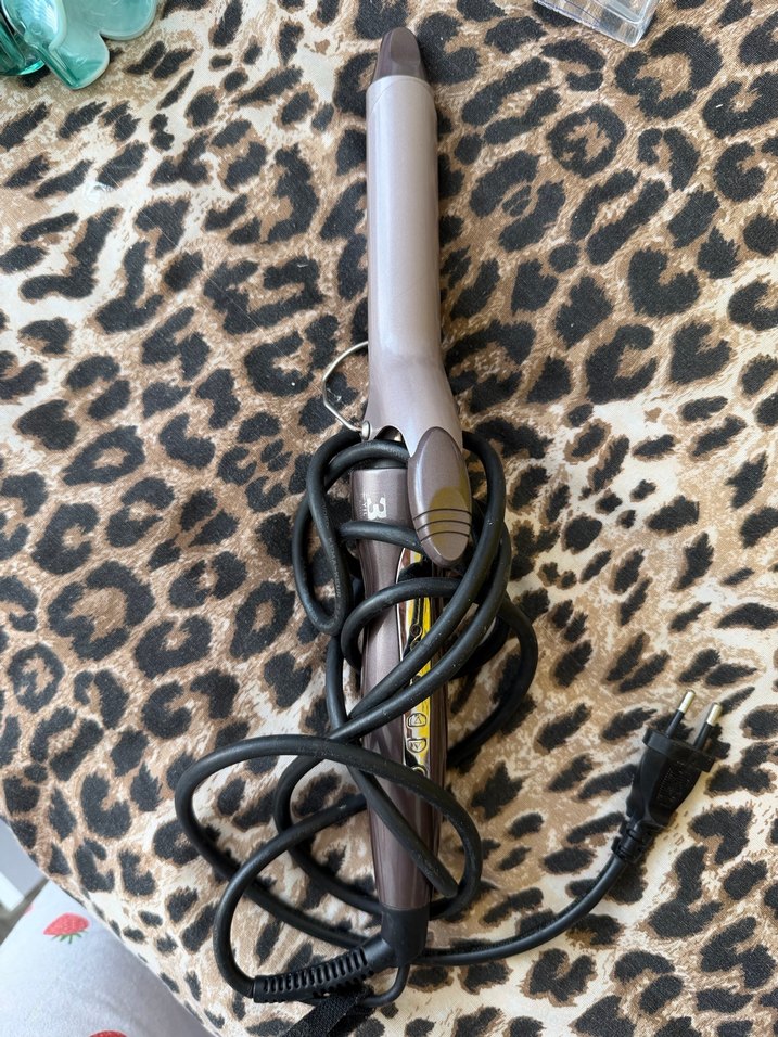 Uzun namlulu, bej ve gri renkli saç maşası, kolay kullanım için kelepçelidir. Güç kablosu ve prize sahiptir.