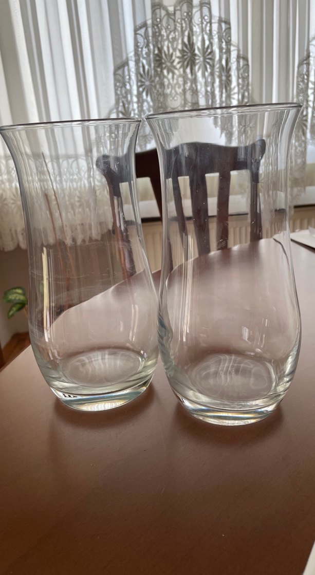 Bej-gri tonlarında, şeffaf camdan yapılmış, kıvrımlı tasarımlı iki vazo seti. Çiçek sergilemek veya dekorasyon için uygundur.
