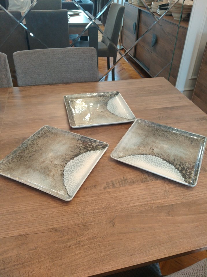 Bej ve gri tonlarda, dokulu desenli üçlü seramik kare tabak seti. Çeşitli yemekler için uygundur. ️