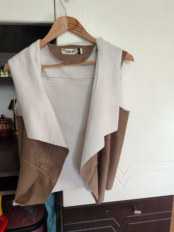 Bej ve gri süet kumaştan, drapeli yakalı, kolsuz kadın yeleği. Normal boy ve regular fit, günlük sokak stili için uygun.
