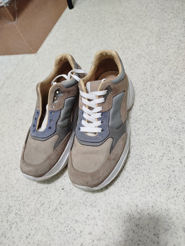 Bej ve gri süet malzemeden yapılmış, bağcıklı kadın spor ayakkabısı. Günlük kullanım ve sokak stili için uygundur.