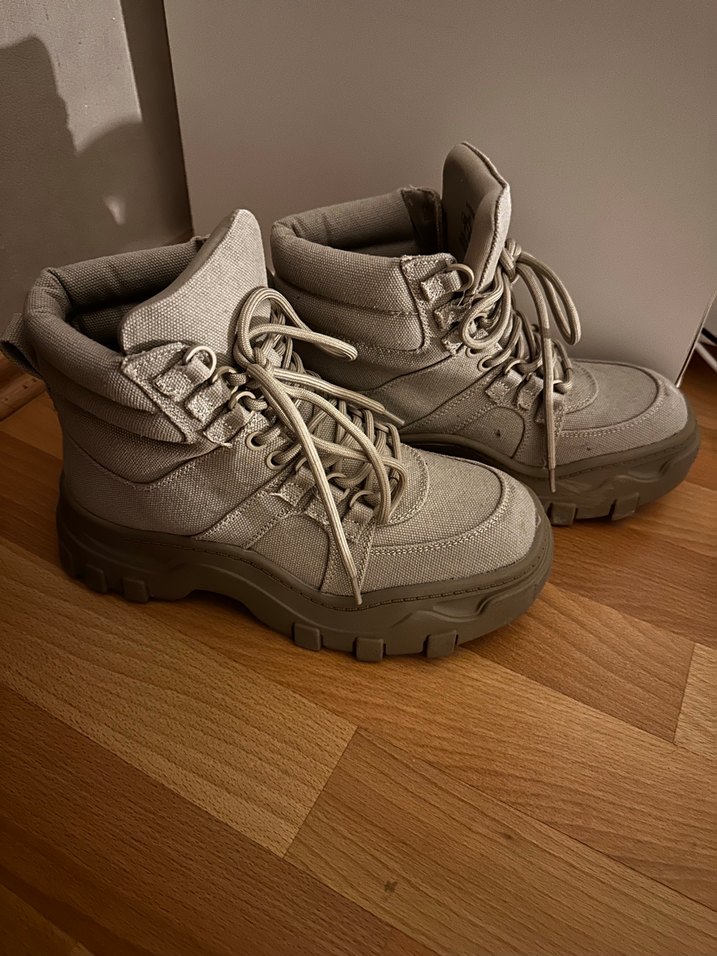 Bej ve gri süet malzemeden yapılmış, bağcıklı, platform botları, sokak stilini zahmetsiz şıklıkla birleştiriyor.