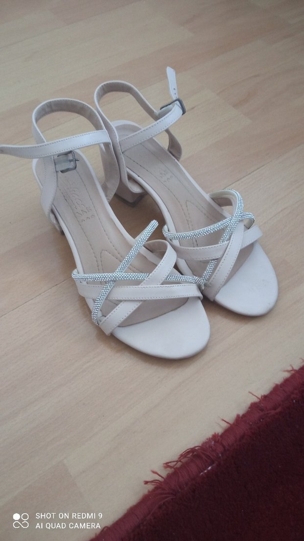 bej gri taşlı Blok Topuklu Kadın Abiye Ayakkabı 3 cm topk