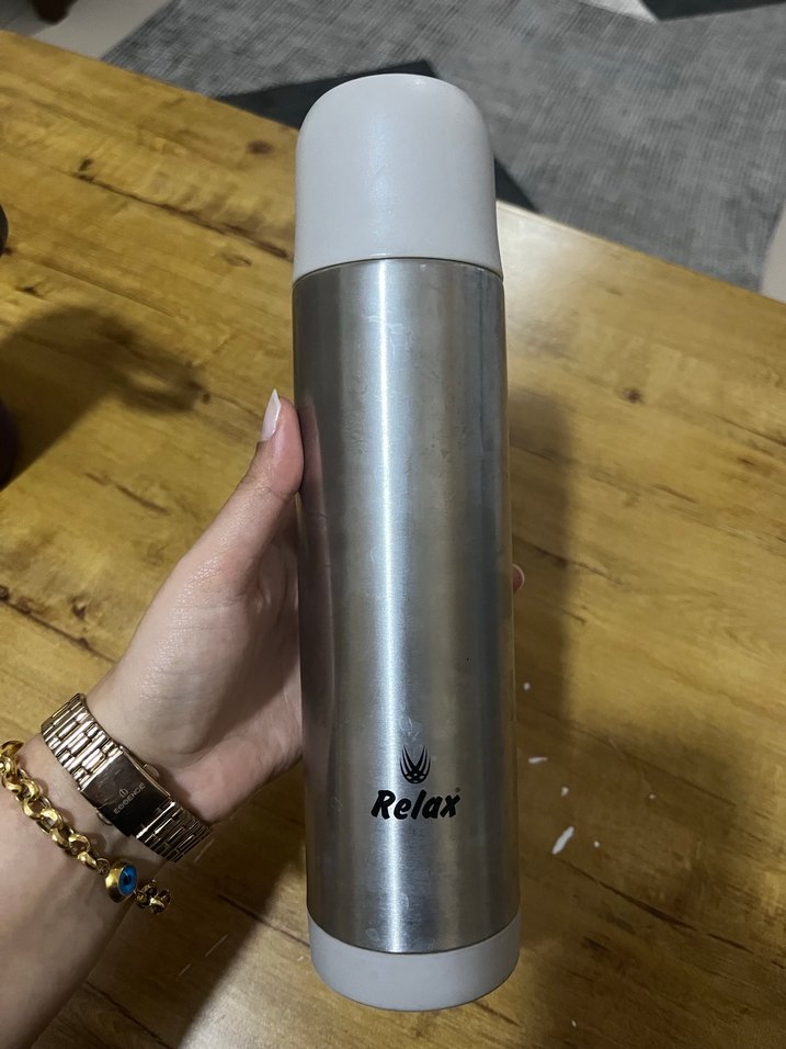 Bej ve gri renklerde, üzerinde 'Relax' yazısı bulunan metal termos matara. Sıcak içecekleri korumak için uygundur.