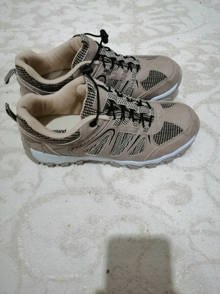 Bej ve gri renkte, yılan desenli ve bağcıklı outdoor ayakkabılar. Trendy casual sokak stili için uygun, dayanıklı kauçuk tabanlıdır.