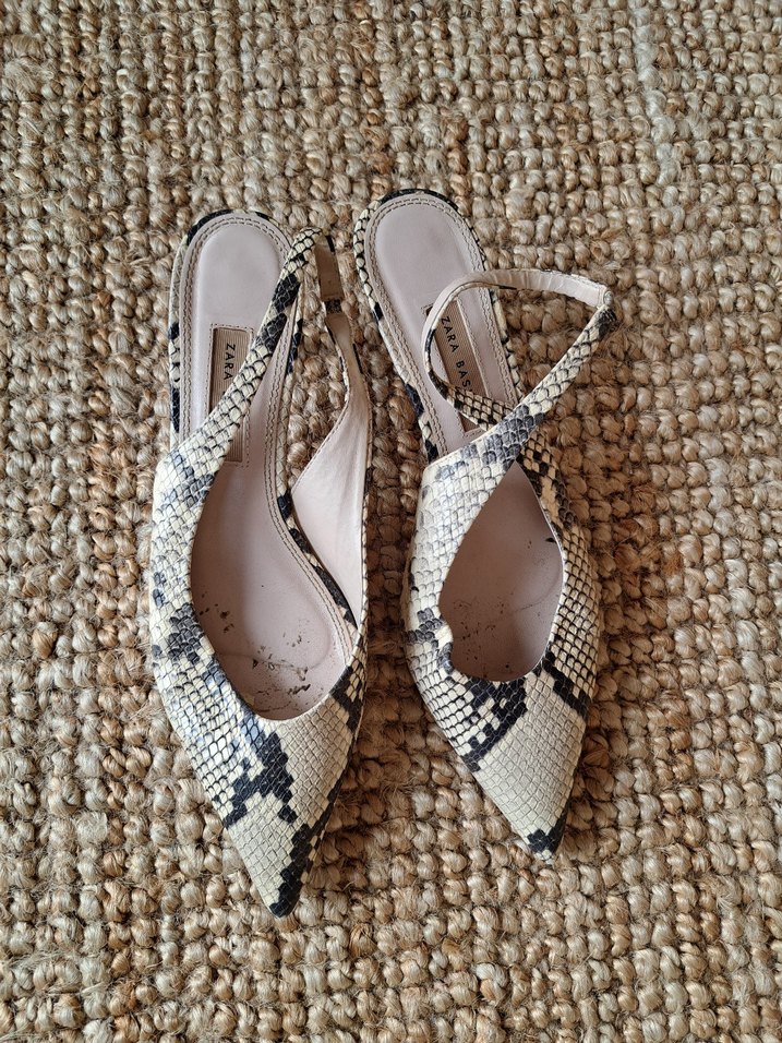 bej gri yılan desenli, ince kısa topuklu, topuktan askılı