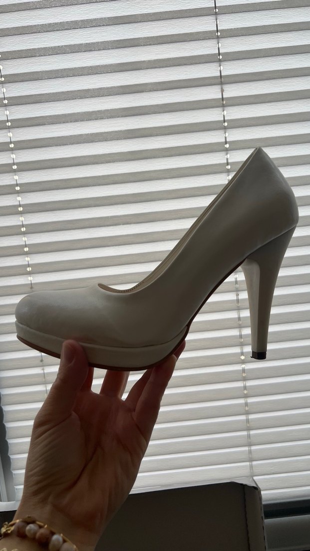 Bej-gri tonlarında, tokalı ve yüksek topuklu kadın stiletto. Kauçuk malzemeden yapılmış, çağdaş ofis stiline uygun.