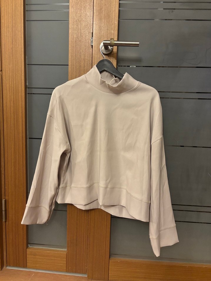 Etiketli sıfır ürün. Bej gri renkli, yüksek yakalı ve uzun kollu, rahat kesimli kadın sweatshirt, yumuşak kumaş ile günlük kullanım için uygundur. Polyester kumaşlıdır. Önündeki leke ile geldi. Değiştirme zamanı geçince kaldı. Defosu budur. Yıkanınca geçer mi bilmiyorum. Bedeni S tir. Kollarında fermuar detayı bulunmaktadır.