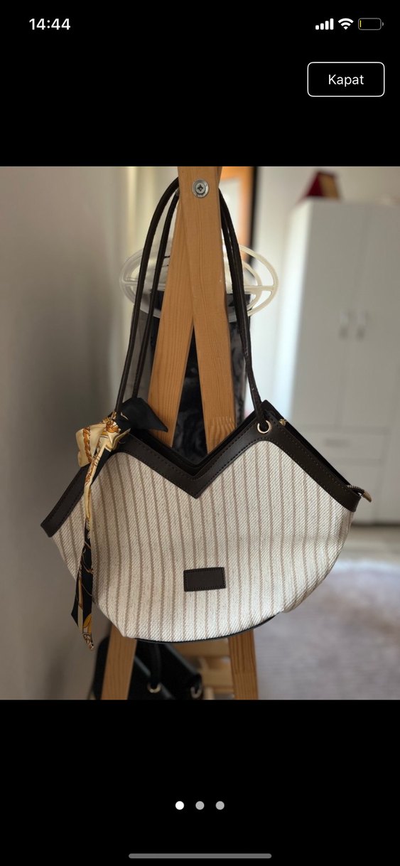 Bej ve gri zebra desenli, tokası olan sentetik kumaştan yapılmış çağdaş tarzda kadın çantası. Trendy günlük kullanıma uygundur.