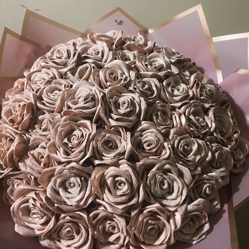 Yumuşak ve narin görünümlü bej güllerden oluşan buket, açık pembe kağıda sarılı. el emegidir insta sudemm_officiall