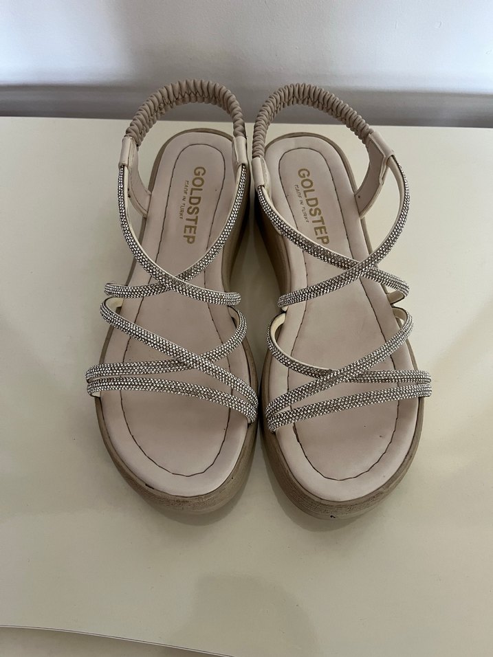 Bej renkli, gümüş taşlı bantlara ve tokalı kapanışa sahip dolgu topuklu kadın sandalet. Kauçuk malzemeden üretilmiştir. Marka: GOLDSTEP.