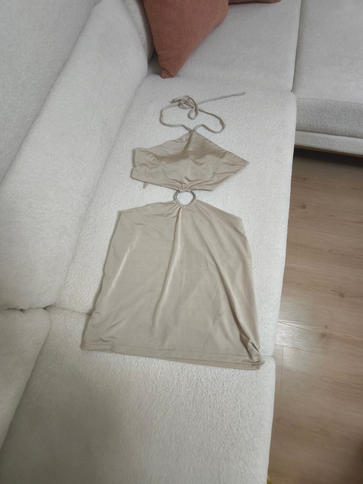 Bej renkte, halter yakalı ve askılı kolları olan, vücuda oturan midi mini elbise. Yumuşak sentetik kumaştan yapılmış, sade ve şık, dış mekan sokak stili için uygun bir parça.
