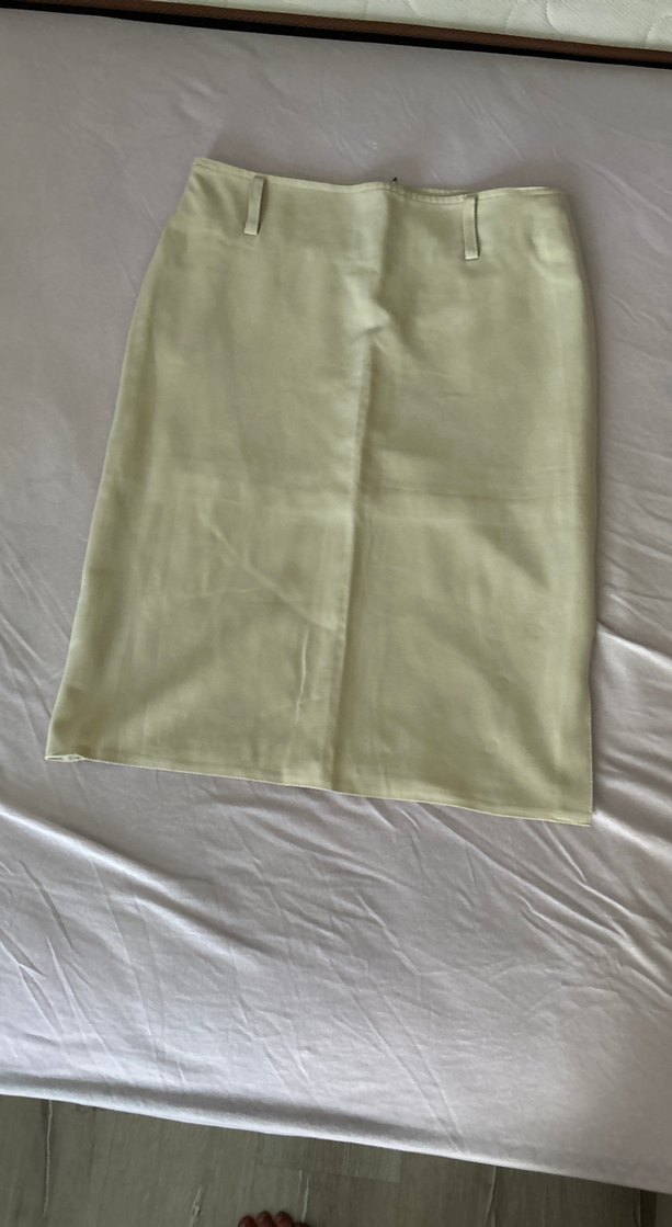 Bej renkte, keten kumaştan normal boy midi hamile eteği. Düz, minimal ve rahat kesimiyle ofis için şık bir seçenek.