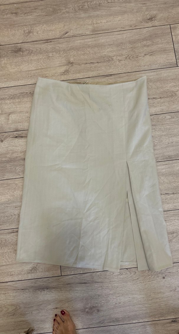 Bej renkli, keten kumaştan uzun pilili hamile eteği. Ofis kullanımı için uygun, sade ve bohem tarzda, rahat kesim.