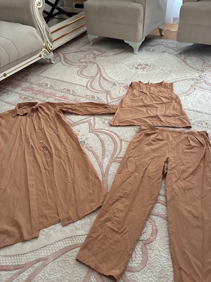 Bej renkte, uzun kollu, straplez üst ve bol kesim uzun paça pantolonlu hamile ve emzirme pijama takımı. Rahat ve desensiz.