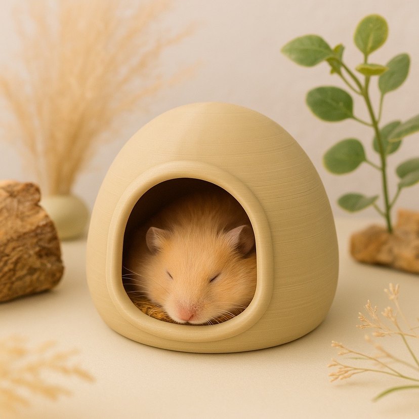 Pastel bej renkli, kubbe şeklinde hamster yatağı, hamsterler için rahat ve özel bir dinlenme alanı sağlar.