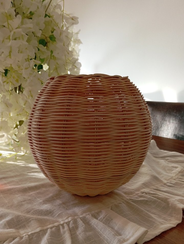 Hafif bej renkte, hasırdan yapılmış küre şeklinde doğal ve ferah tasarımlı vazo.
