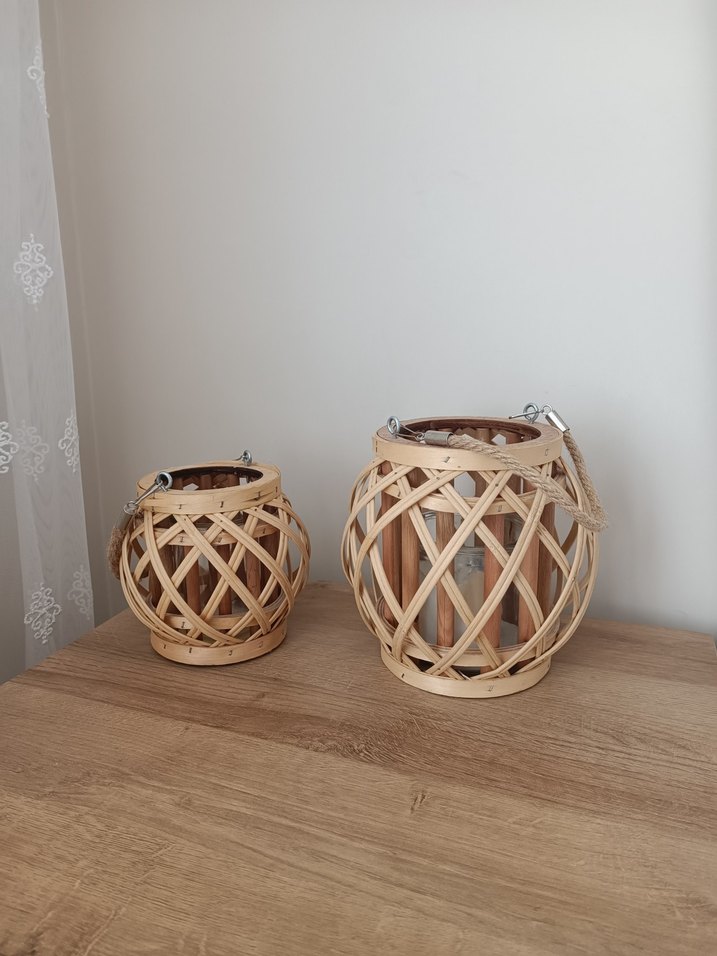 İki adet cam iç yüzeyli, hasır örme ve ip saplı bej mumluk seti. Mekanınıza doğal bir dokunuş katmak için ideal. ️