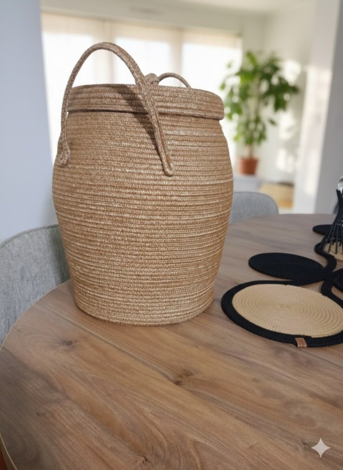 Saplı, açık bej renkte dokuma saklama sepeti, düzen sağlamak ve mekâna doğal bir dokunuş katmak için uygun.