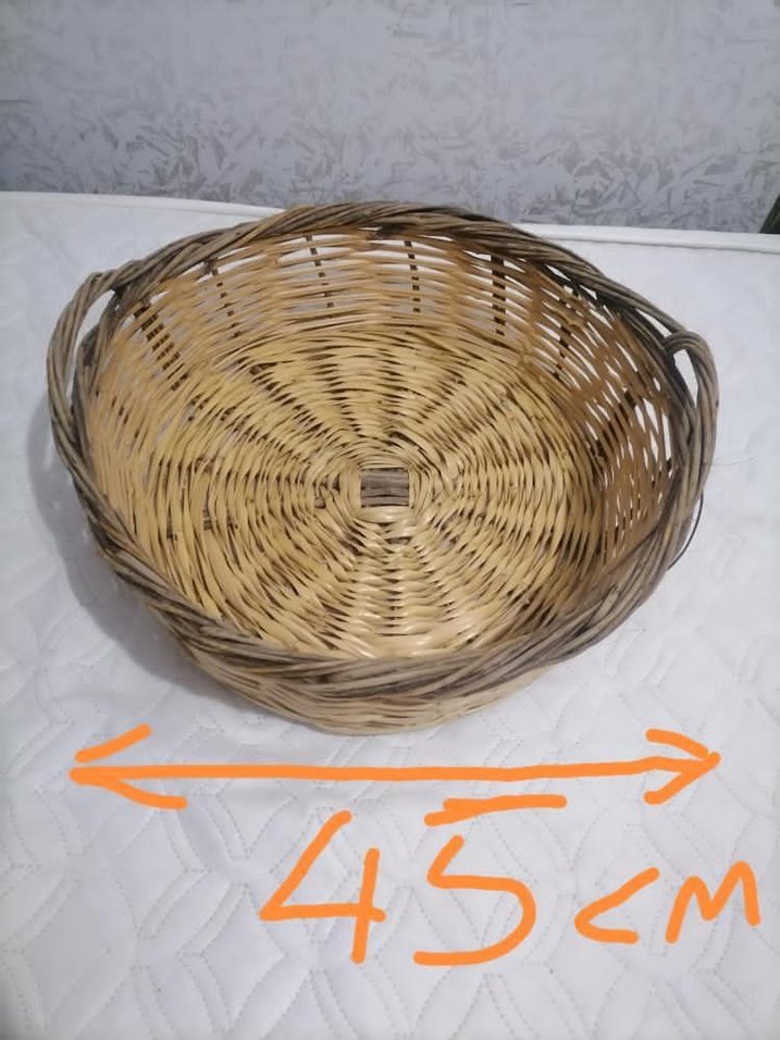 Saplı bej hasır sepet, 45 cm çapında, saklama ve düzenleme için uygundur.