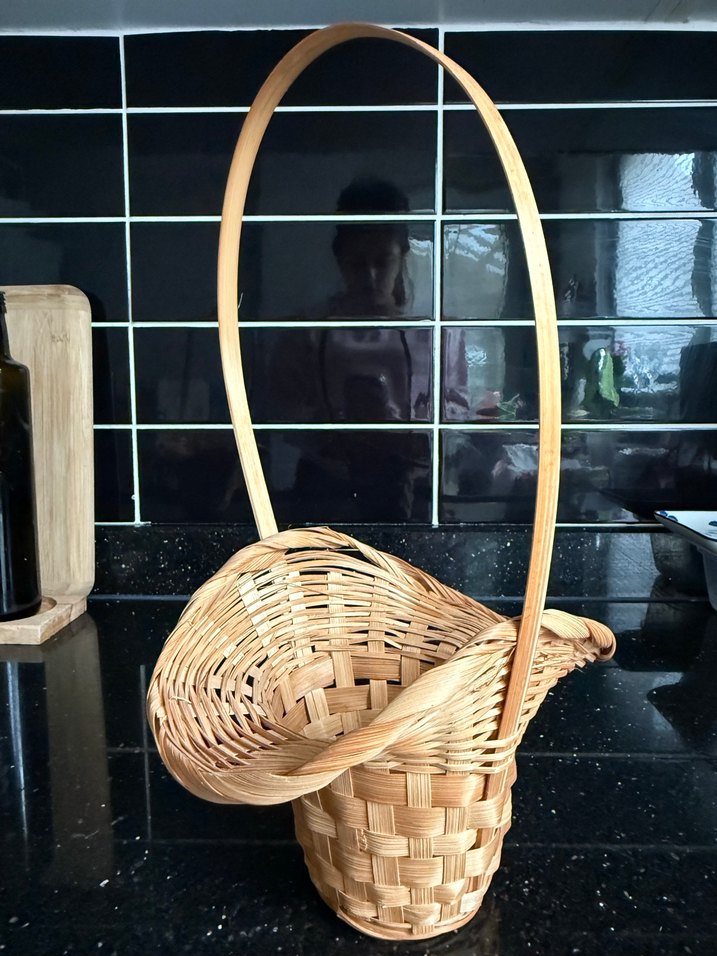 Uzun saplı, koyu bej renkli hasır dokuma sepet, depolama ve taşıma için uygundur. defosuz iki adet mevcut