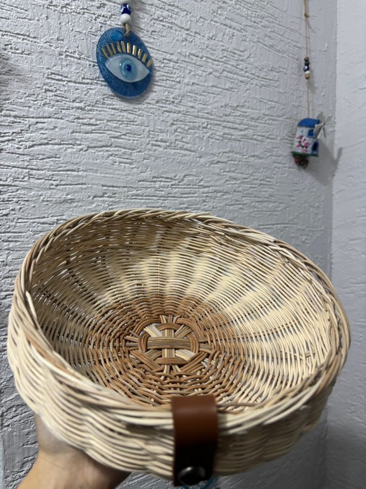 Deri kayışlı, doğal dokulu bej hasır sepet. Depolama ve düzenleme için uygundur. Tane fiyatıdır.