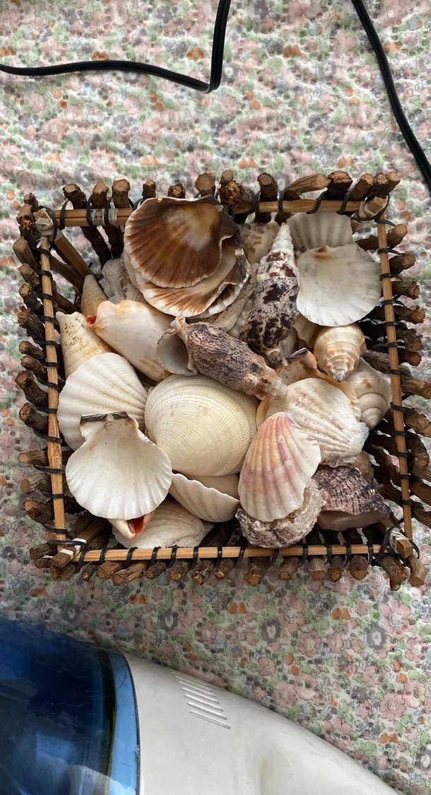 Bej renkli hasır sepet içinde çeşitli açık renk deniz kabukları bulunur.