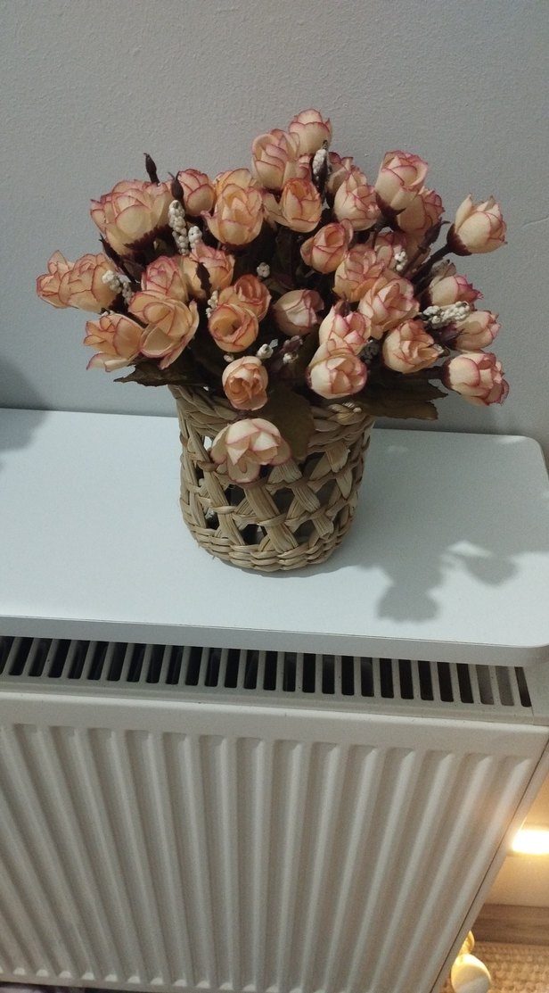Bej renkli dekoratif çiçekler, hasır bir sepette düzenlenmiş olup ev dekorasyonuna doğal bir dokunuş katar. Hafif tonlarıyla yumuşak ve sıcak bir atmosfer sağlar.